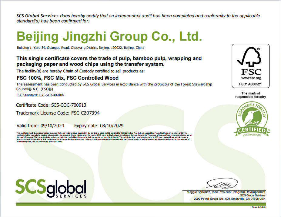 FSC認證(森林管理委員會(huì )“ForestStewardshipCouncil”認證)是全球最為權威且嚴格的森林認證體系。其核心宗旨在于推動(dòng)森林資源的可持續開(kāi)發(fā)與利用,同時(shí)致力于生物多樣性的保護及森林生態(tài)平衡的維護。京紙集團榮獲FSC權威認證,意味著(zhù)企業(yè)在森林資源管理方面達到了國際領(lǐng)先水平,進(jìn)一步提升了企業(yè)品牌價(jià)值和市場(chǎng)競爭力,為可持續高質(zhì)量發(fā)展注入了強勁動(dòng)力。